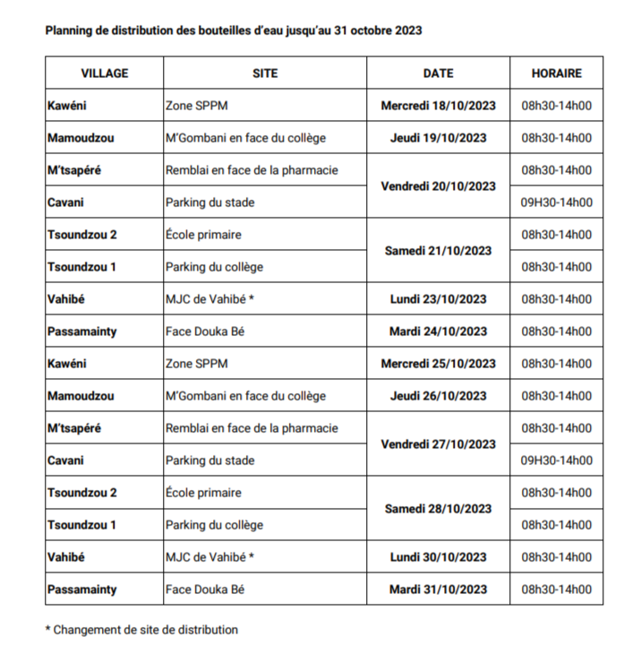 Afin de faire face aux risques sanitaires engendrés par la crise de l’eau, l’État a décidé de distribuer gratuitement des bouteilles d’eau aux personnes les plus fragiles. Le Gouvernement a défini les ayants droits. La Ville de Mamoudzou et son centre communal d’action sociale poursuit sa mobilisation pour appuyer l’État dans sa distribution de bouteilles d’eau aux administrés de Mamoudzou. Les personnes vulnérables répondant aux critères définis par l’État sont invités à se présenter sur le site de distribution correspondant à leur village de résidence selon le planning de distribution suivant. Les ayants droit non recensés à ce jour par le CCAS peuvent se faire recenser sur site le jour de la distribution. Ils peuvent également déléguer un mandataire adulte pour récupérer leurs bouteilles d’eau. Pour rappel, des bacs de récupération des bouteilles vides seront mis à disposition sur les sites de distribution. Les distributions ne seront effectuées qu’aux personnes ayant ramené les précédentes bouteilles distribuées vides.