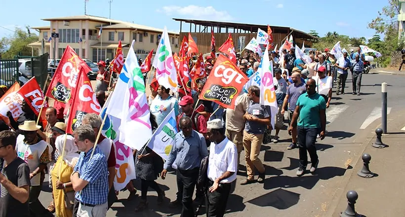 « C’est une première depuis 2011 », a fièrement affirmé Henri Nouri, co-secrétaire départemental de la FSU Mayotte et secrétaire général du Syndicat National des Enseignements de Second degré (SNES), en préambule de la manifestation. En effet, l’appel massif à la mobilisation de tous les syndicats représentant l’ensemble des personnels de l’Éducation nationale était inédit. Ce lundi matin, trois des principaux syndicats de l’Éducation nationale (FSU, UNSA-Éducation et SGEN-CFDT) regroupés en intersyndicale étaient représentés par une centaine de manifestants devant les locaux du vice-rectorat de Mamoudzou pour protester contre la suppression de 2.650 postes, la précarité de la profession, la réforme de l’enseignement professionnel et celle du lycée. Les manifestants ont marché jusqu’au dispensaire de Jacaranda pour marquer leur refus « net et précis » de la réforme.