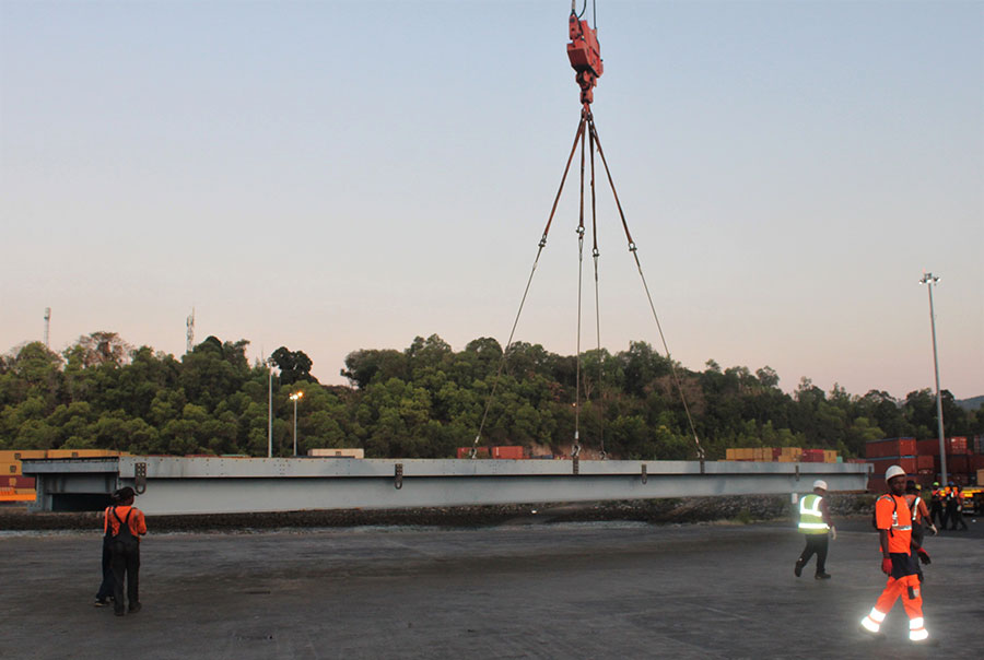 En même temps que le soleil se couche, le pont temporaire de Dzoumogné est descendu par une trentaine d’hommes sur le quai du port de Longoni, ce jeudi 6 octobre. Devant l’urgence de la situation, l’État a décidé de faire venir un viaduc temporaire de La Réunion qui se superposera au vieux pont dont les planches de bois montrent des signes de faiblesse.